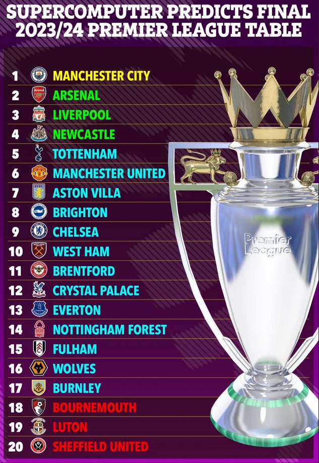 တနင်္ဂနွေနေ့က ပွဲတွေ အပြီး ထုတ်ပြန်လာတဲ့ ၎င်းရဲ့ ပရီးမီးယားလိဂ် ခန့်မှန်းဇယားမှာ မန်စီးတီးကသာ ထိပ်မှာ ရှိနေပါတယ်။ အကြိမ်ရေ ၁ သိန်း တိတိ တွက်ချက်စစ်ဆေးခဲ့ပေမယ့် စူပါကွန်ပျူတာ BETSiE ရဲ့ ရွေးချယ်မှုကတော့ မန်စီးတီးပါပဲ။