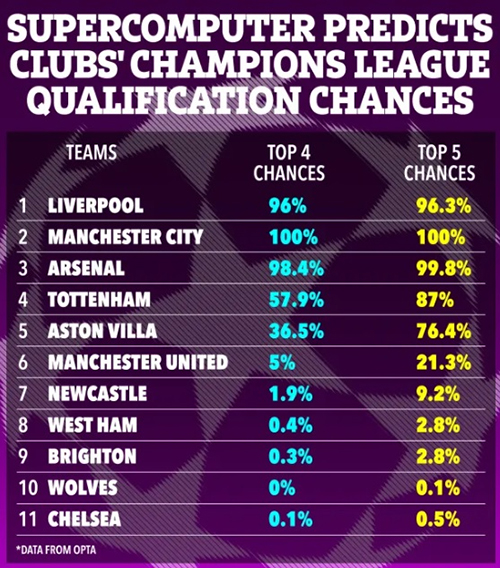 ကစားသမားနဲ့ အသင်းတွေရဲ့စွမ်းဆောင်မှုအချက်အလက်တွေကို စုဆောင်းဖော်ပြတဲ့ Opta ရဲ့စူပါကွန်ပျူတာဟာ ဗီလာနိုင်ပွဲအပြီးမှာ မန်ယူရဲ့ချန်ပီယံလိဂ်အခွင့်အရေးကို ၅ ရာခိုင်နှုန်းပဲ တိုးပေးခဲ့ပါတယ်။